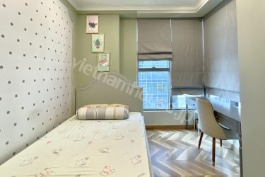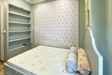 重厚感のある共有スペースとは対照的に、セカンドベッドルームは小さなお子様向けに特別にデザインされています。流行のくすみ系パステルカラーをベースに、可愛らしいアニメーション柄をあしらった遊び心溢れる空間となっております。大人向けの上質な設えと、お子様向けの楽しいデザインが見事に融合したこのお部屋は、小さなお子様のいるご家庭はもちろん、三世代でのご同居を検討されている方にも非常に魅力的な物件です。