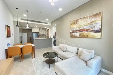 This spacious 2-bedroom apartment is designed in a minimalist modern style with a warm beige palette, creating an elegant and cozy atmosphere. Premium furnishings are smartly arranged to maximize both function and comfort. The bedrooms are generously sized, opening to serene views of lush internal gardens and vibrant city streets—offering privacy yet openness.
