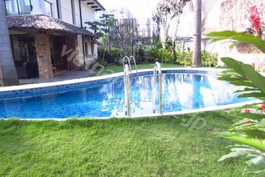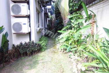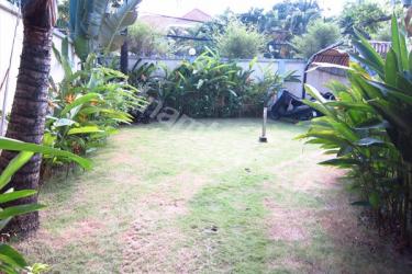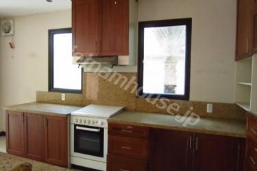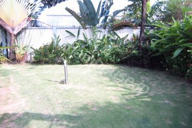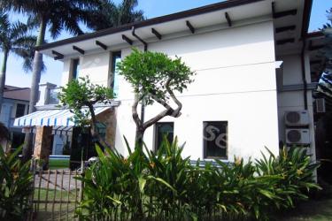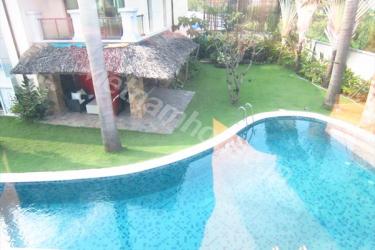 スクウェアの形がお洒落なビラ。照明が暖色系で統一されているので、落ち着いた雰囲気になっています。芝生が気持ちいいお庭とプールもあり、コンパウンド内なのでご家族では安心のお住まいです。